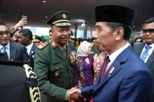 JABAT TANGAN- Panglima Angkatan Bersenjata Timor Leste (FALINTIL-Forsa Defesa Timor Leste) Letnan Jenderal (Letjen) Domingos Raul Falur “Rate Laek” berjabatan tangan dengan Presiden RI, Joko Widodo usai menghadiri upacara Hari Ulang Tahun (HUT) ke-79 Tentara Nasional Indonesia (TNI) di Lapangan Silang Monumen Nasional (Monas), Jakarta, Sabtu (5/10/2024).