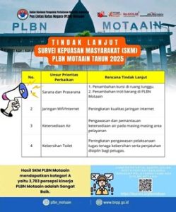 Hasil survei internal menjadi dasar penetapan sejumlah unsur prioritas perbaikan yang akan ditindaklanjuti secara bertahap dan terukur.  Rencana tindak lanjut yang telah disusun meliputi peningkatan sarana dan prasarana melalui penambahan kursi ruang tunggu dan troli barang, peningkatan kualitas jaringan WiFi/internet, penguatan pengawasan ketersediaan air pada setiap area pelayanan, serta peningkatan kebersihan toilet melalui pengawasan kinerja dan penegakan disiplin petugas kebersihan.