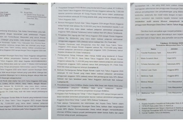 Takirin-Belu — Warga Desa Takirin, Kecamatan Tasifeto Timur, Kabupaten Belu, melaporkan adanya dugaan ketidaksesuaian pengelolaan Dana Desa Tahun Anggaran 2023 hingga 2025. Dugaan tersebut mencuat setelah masyarakat menemukan perbedaan antara laporan administrasi penggunaan anggaran dan kondisi fisik sejumlah kegiatan pembangunan di lapangan. Laporan tersebut tertuang dalam surat pengaduan dan permohonan audit yang disampaikan kepada Bupati…